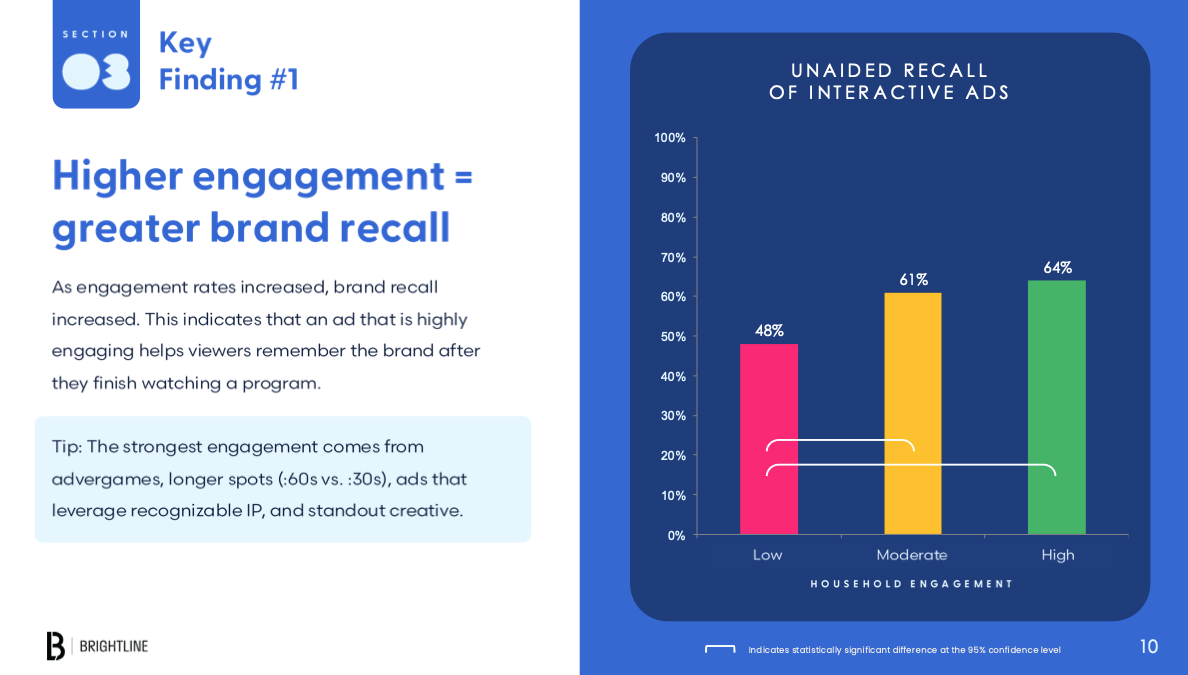 - Higher engagement = higher impact. Households with higher interaction rates saw stronger lifts in brand recall and purchase intent.