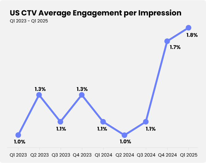 We’re seeing this shift in our own data, which we regularly share with eMarketer for use in industry charts and graphics. Our latest findings reveal a spike in engagement with interactive formats, measured through first-party data that captures when a viewer clicks their remote to interact with an ad.
