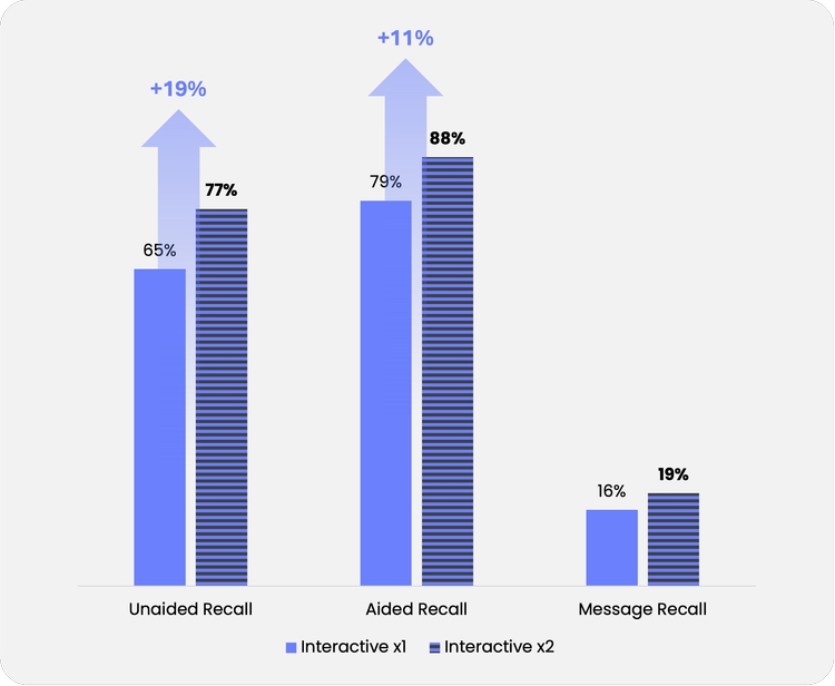 Two exposures of the interactive ad also increase unaided and aided recall metrics further than one alone.