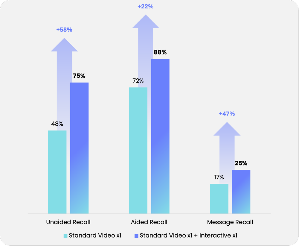 A single exposure to an interactive ad leads to +36% stronger unaided brand recall than a single exposure to a standard video unit. Four-fifths of viewers were able to correctly identify the advertiser.