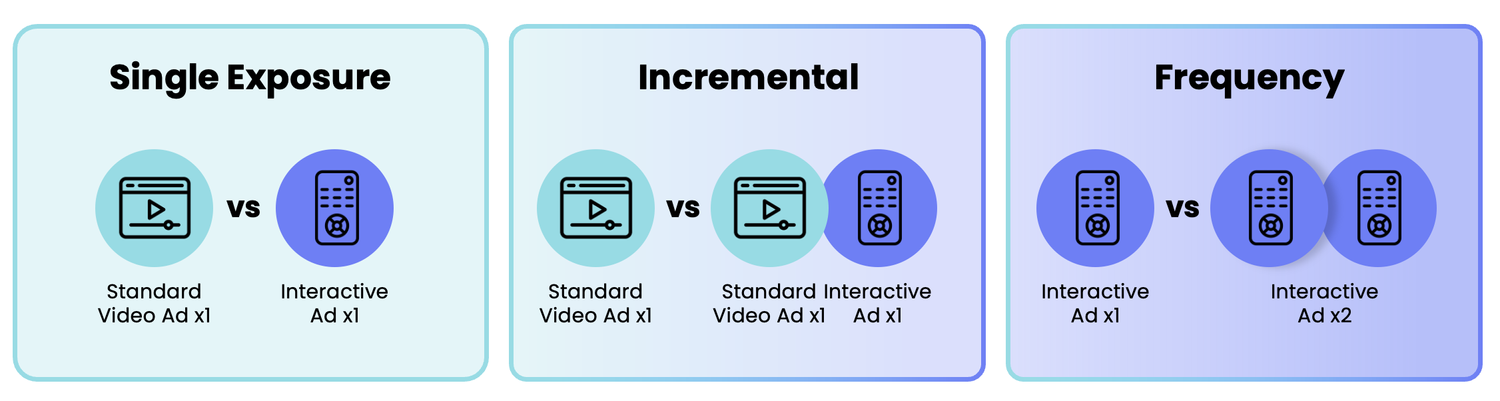 To answer this question, BrightLine partnered with MediaScience to understand the independent and incremental impact of interactive streaming overlays. In this study, we compare the relative impact of a single exposure to either a standard video or interactive ad when viewed individually and, separately, when paired together. The study also compares one interactive ad exposure to two interactive ad exposures.